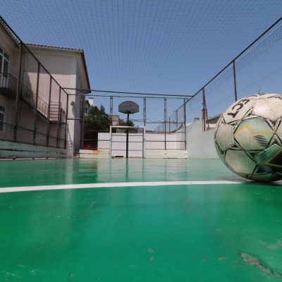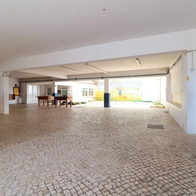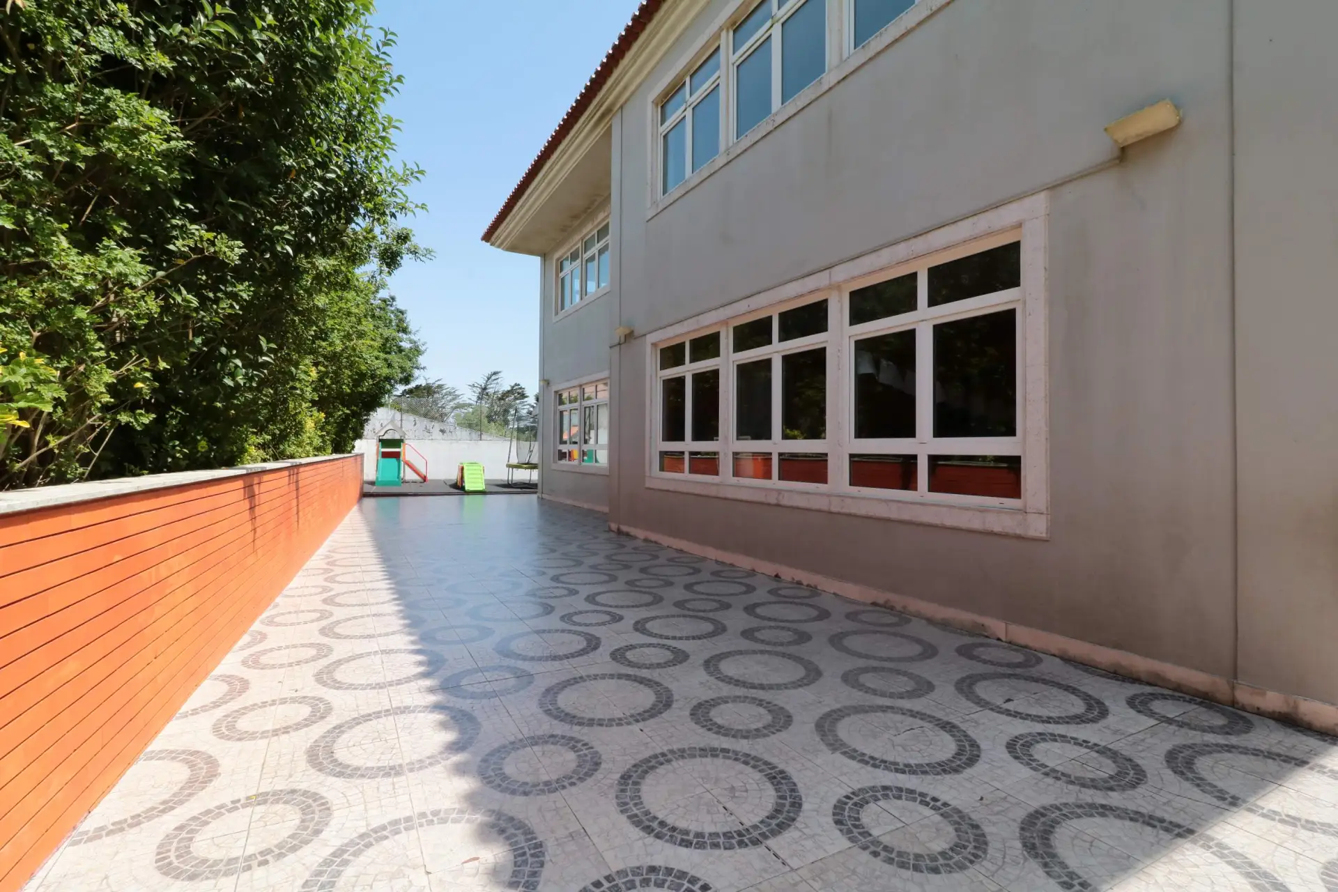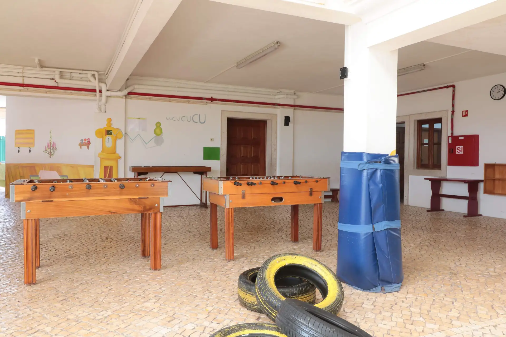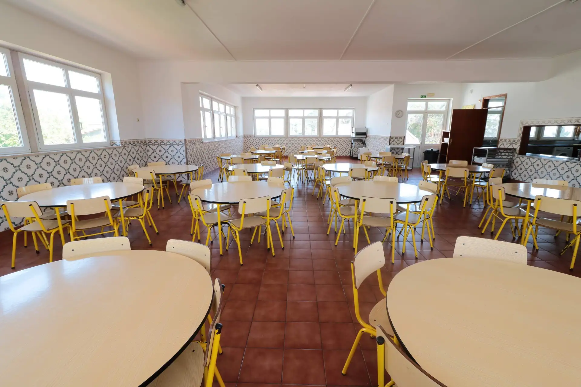 Galeria de espaços da escola: refeitório, ginásio, exterior, recreio coberto e outros